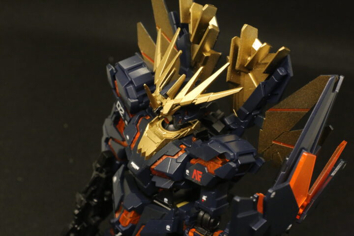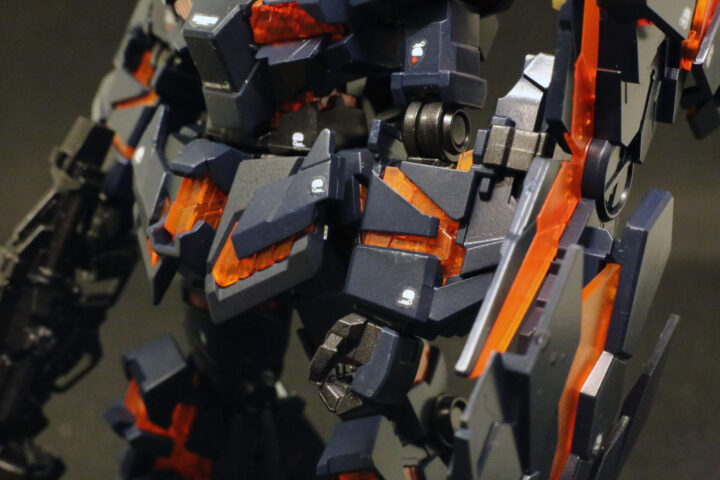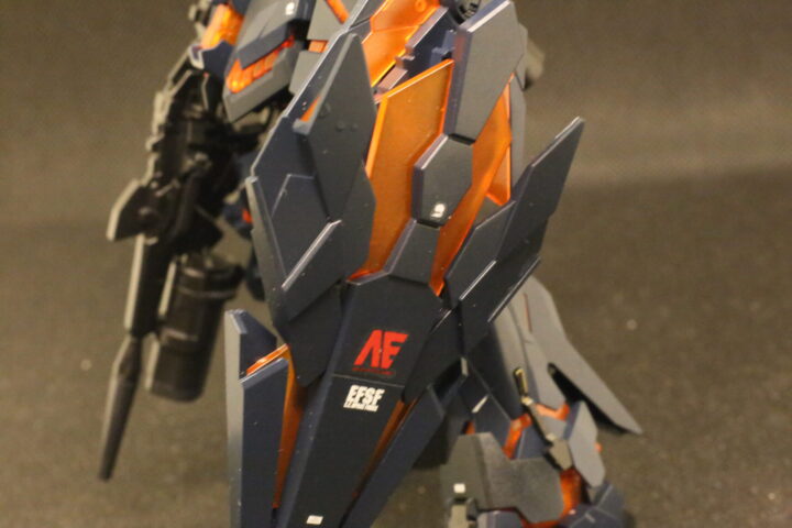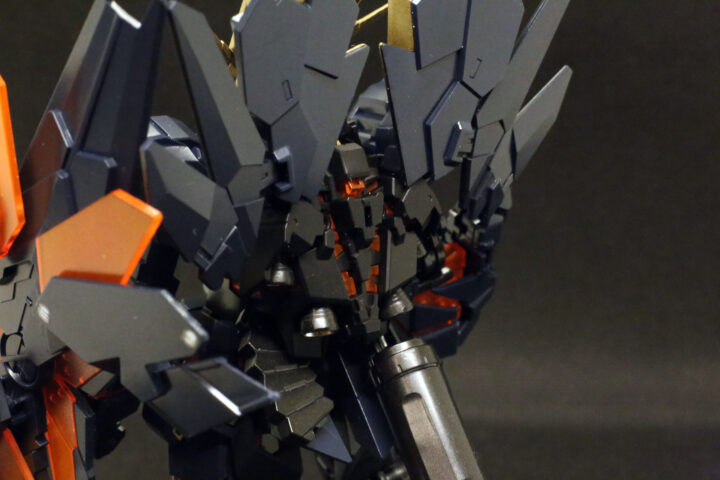 サイコフレームはメタリックオレンジと蛍光レッドを調色し半透明にサッと吹きかけ。まずまずの質感に。サイコフレームをどう表現するかは難しい。