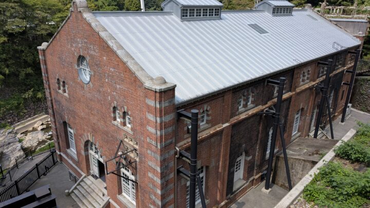 鉱山から見えない背面には耐震補強で鉄骨のバットレスが出ています。