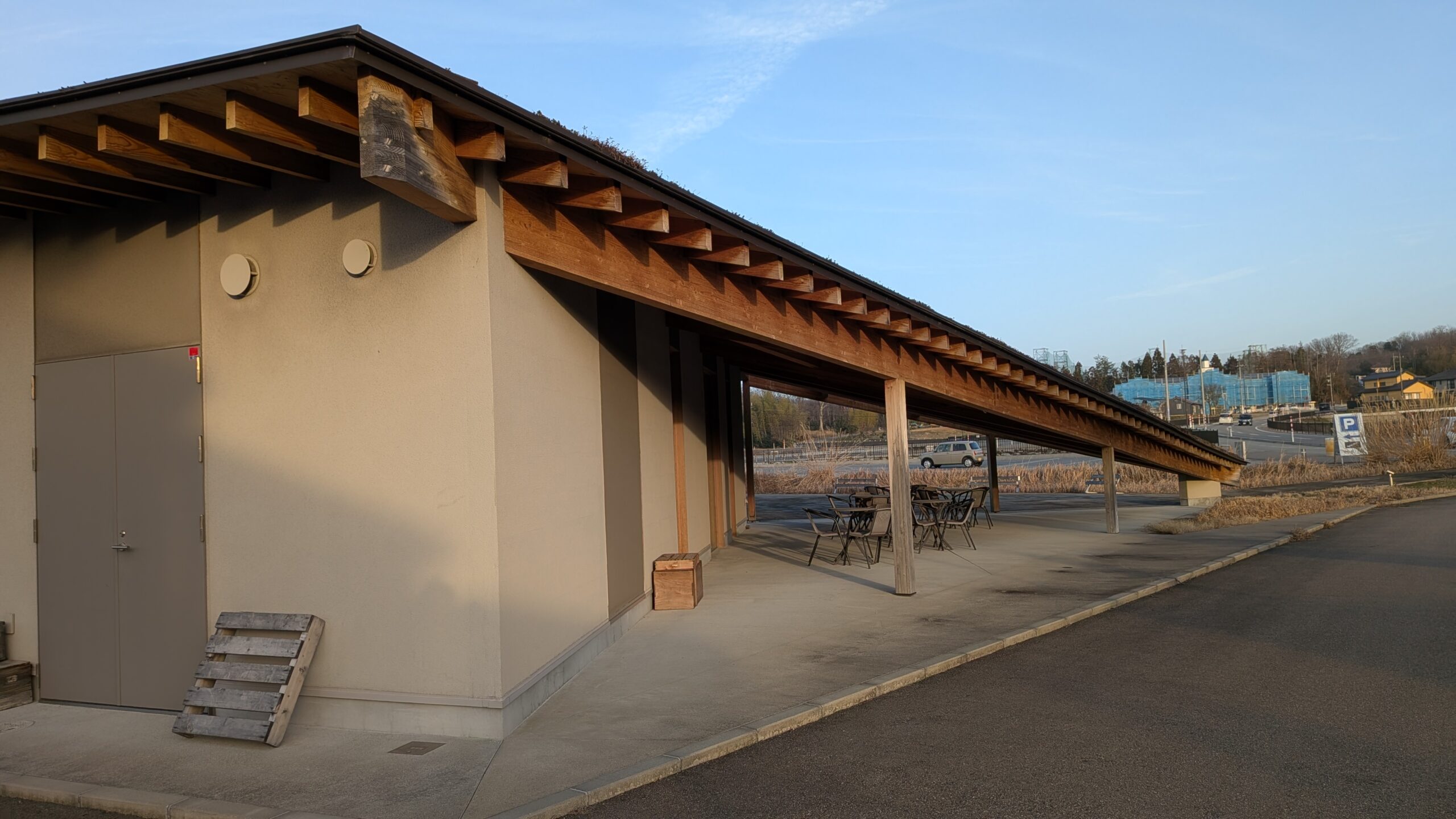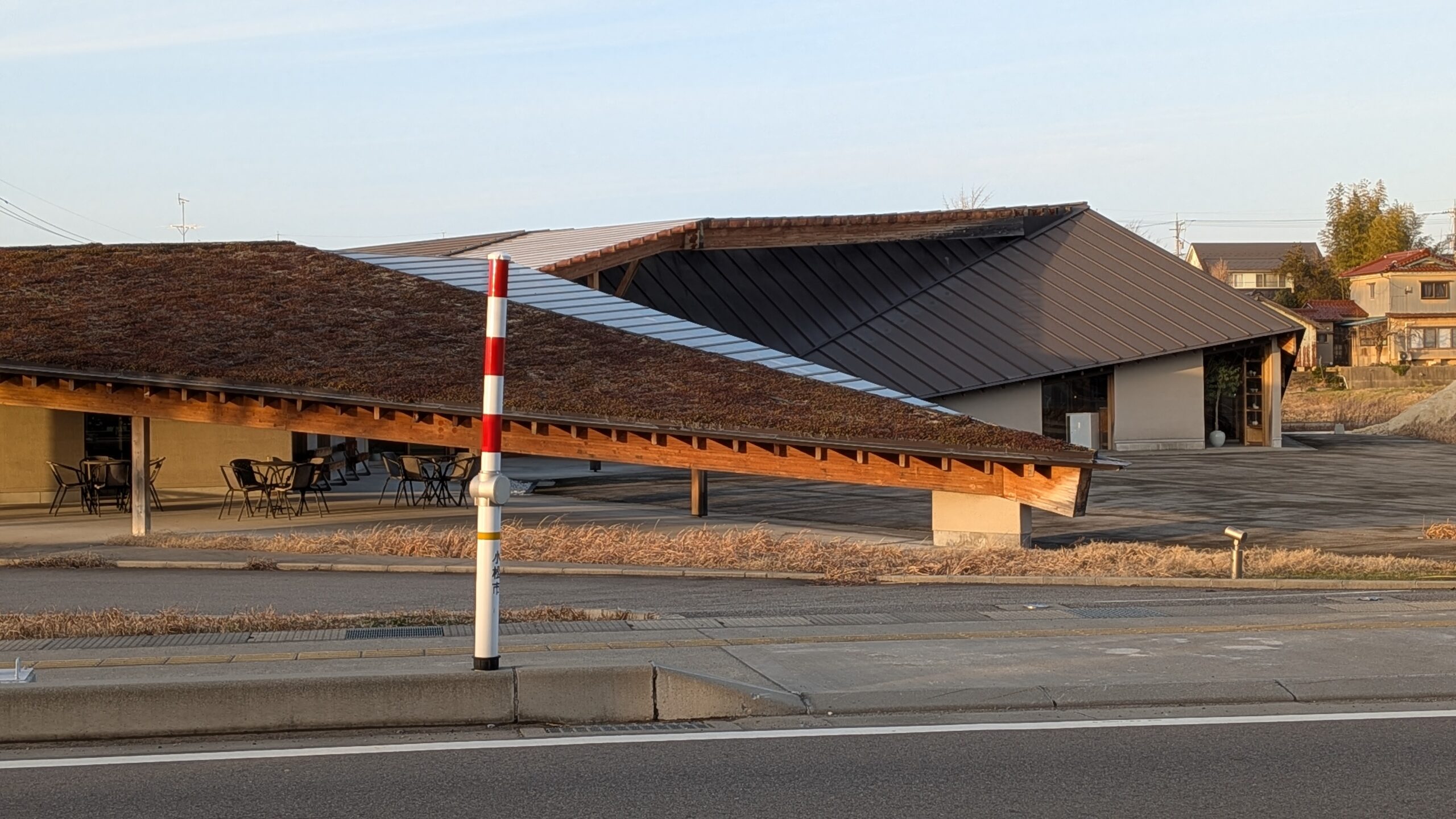 車で近づくと、低く抑えられた異質な外観が目に入る。