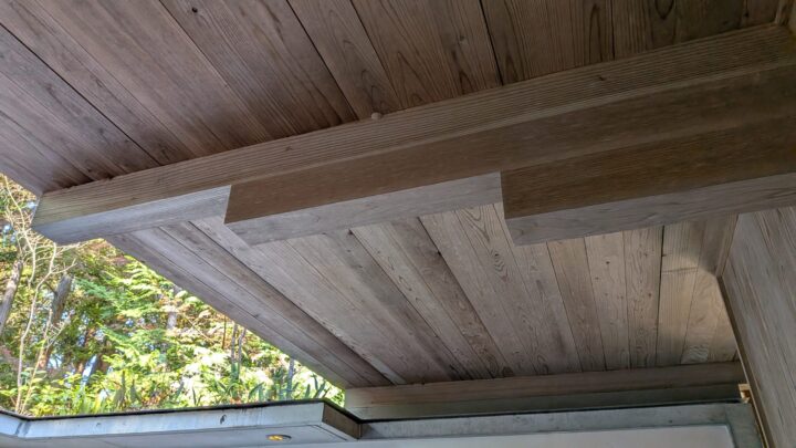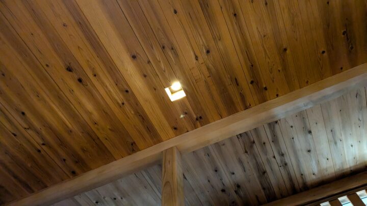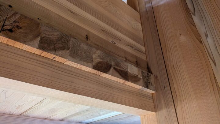 柱や梁、天井スラブは全て県産材の105mm角のスギで構成。特に天井スラブは、下からだと板に見えるが、側面から見ると角材が並べられているのがわかる。