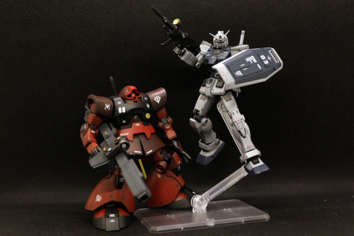 グレーのガンダムと赤いドム。アニメとは異なる、小説版ならではの「渋い」関係性を反映した2機を並べると、戦場の緊張感がより一層引き立つ気がします。