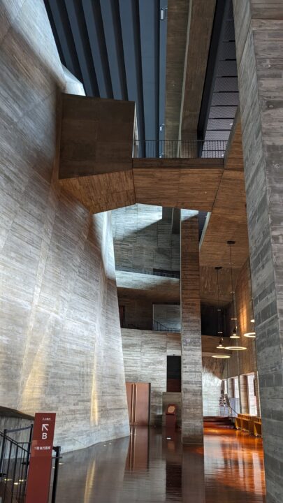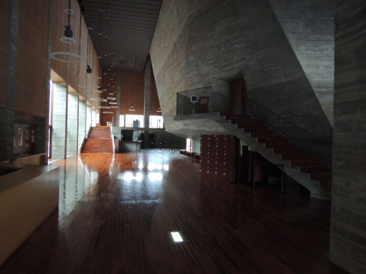 劇場は、1500席の大ホールと400席の小ホールを備え、音響設計と構造美が融合した空間。