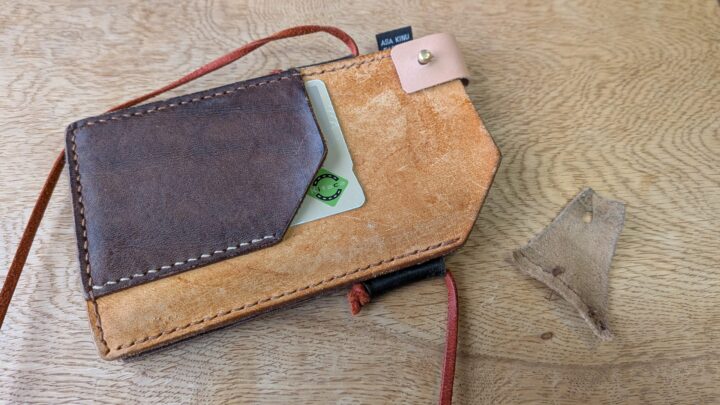 首からかけれるスマホケース。妻用。 北海道で買ったキタカが入るポケット付き。 スマホの厚み分は革ひもの厚みで確保。 |