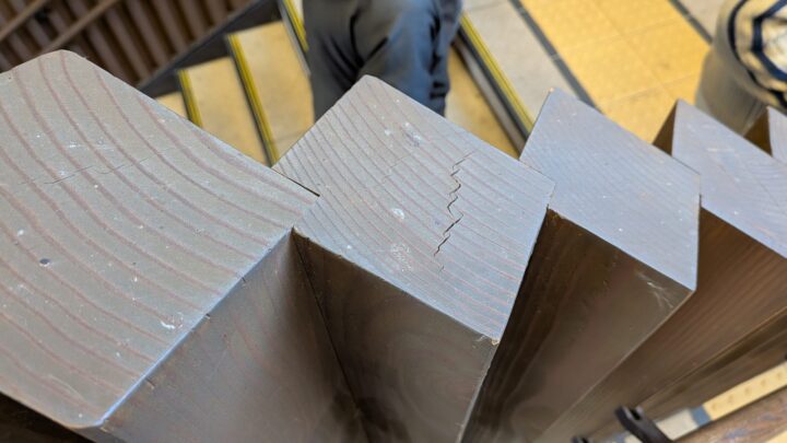 駅舎の外壁に近づくと、まず目に飛び込んでくるのが角ログをずらしながら積んだ外壁。