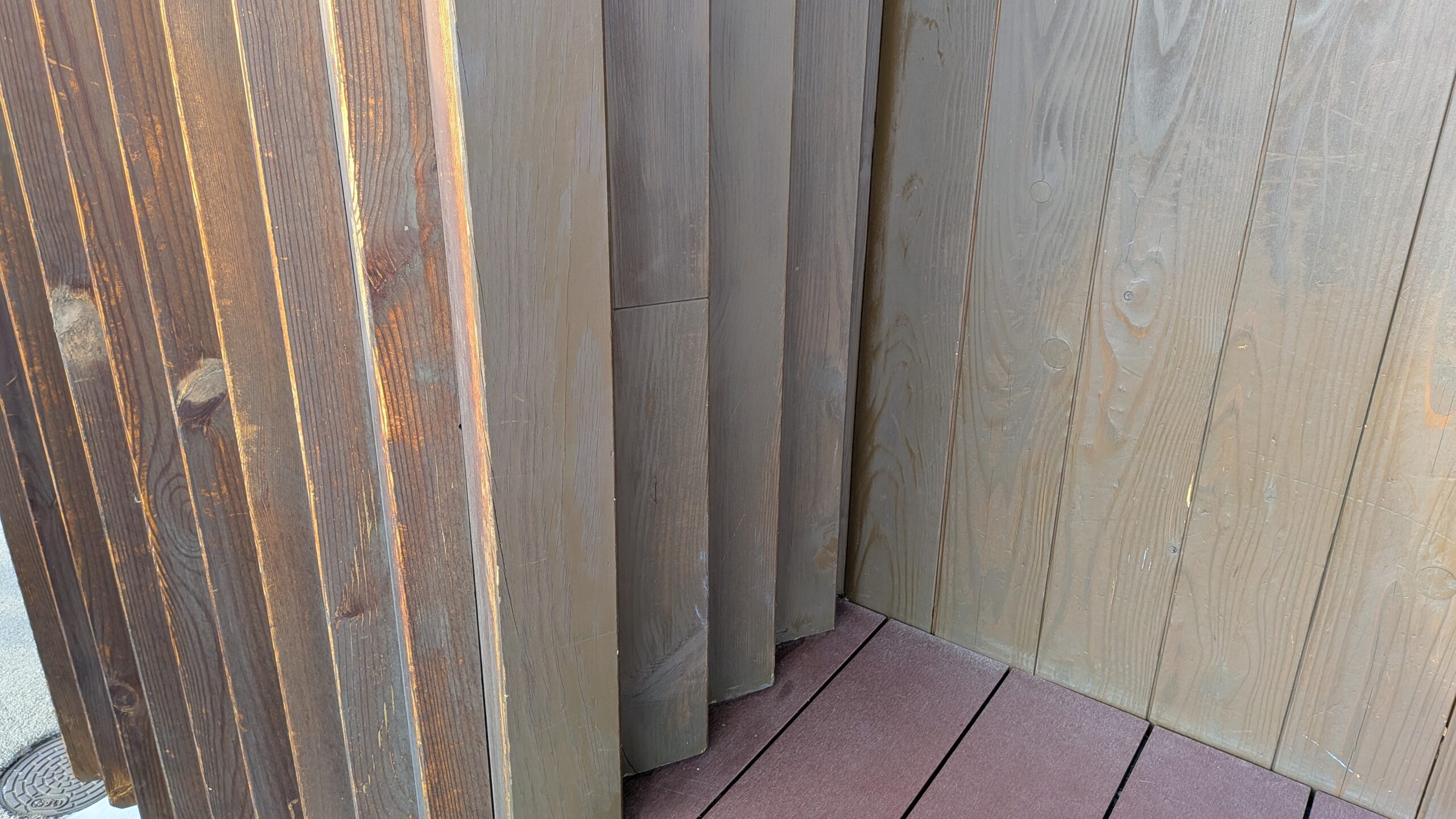 駅舎の外壁に近づくと、まず目に飛び込んでくるのが角ログをずらしながら積んだ外壁。