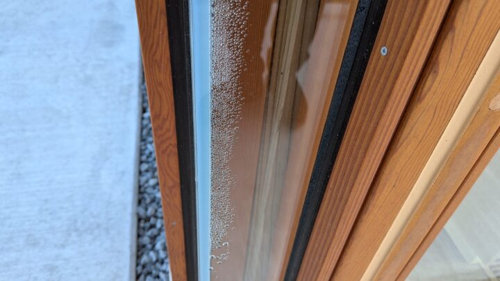 コーナー部はシングルガラスで抑えていますが、軽井沢の寒さでは、結露が発生。手の入らない部分だけに今後の劣化やカビが心配です。