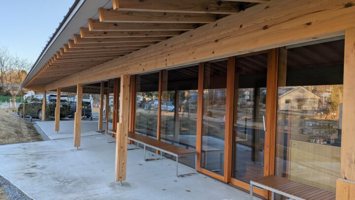 エントランス上部の垂木は白化していて、準不燃薬剤が水蒸気と反応して表出している。目線に近く目立つ部分だけに残念。