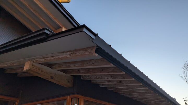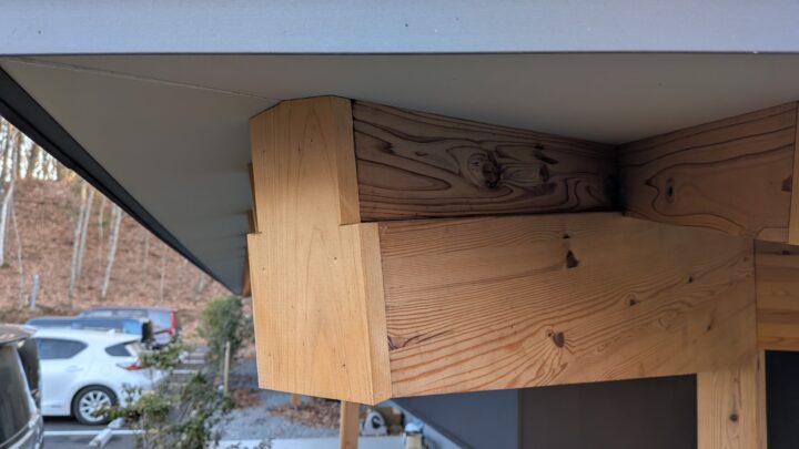 もっと気になるのは、垂木の先端に張られたヒノキ板。おそらく小口の劣化対策?と思われますが、取ってつけたような感じ。