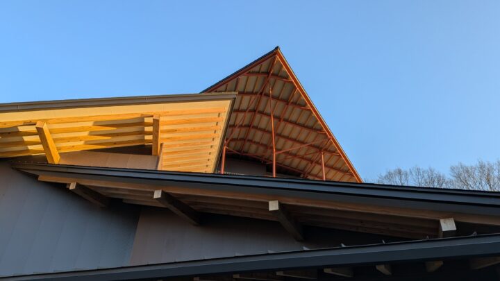 内部は、紙飛行機屋根を支える櫓の構造の外部に、在来軸組み構造が取り囲む立体感のある架構です。