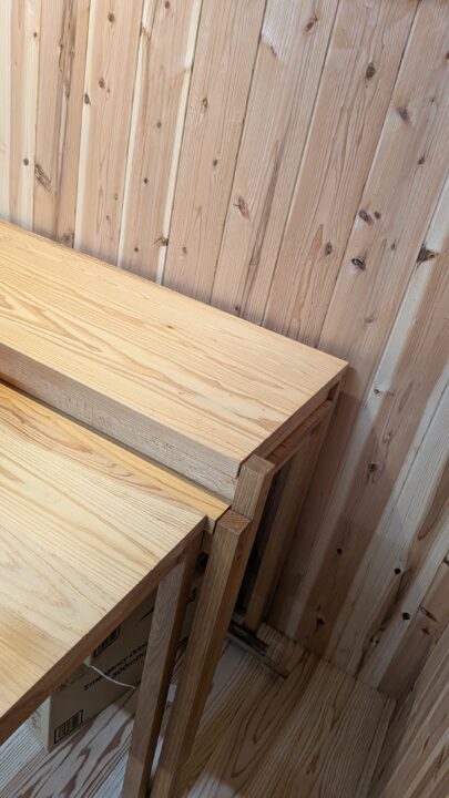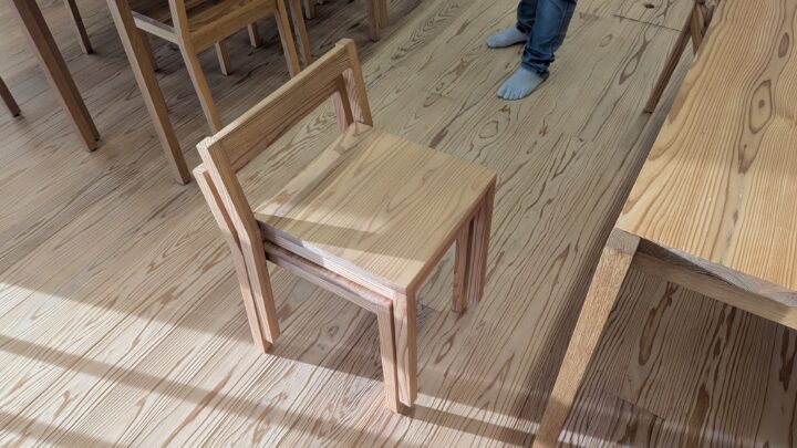 スタッキングできる椅子と机も基本は杉でできていて軽くて扱いやすい。