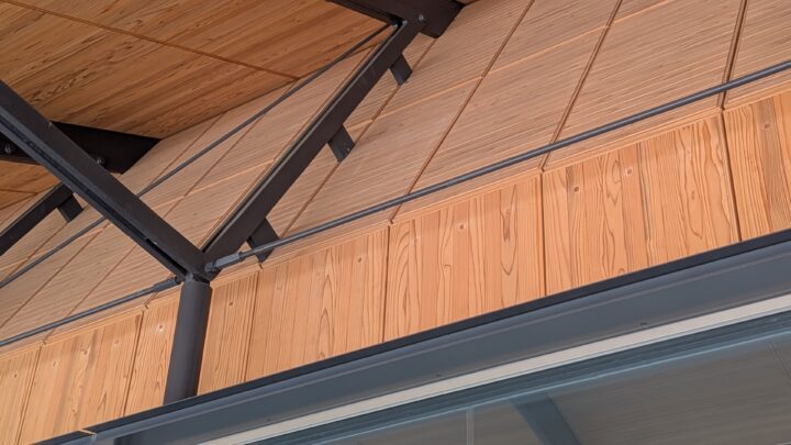 外壁は小幅板をパネル化したものを吊りつけてあり、目地がきれいに通っています。