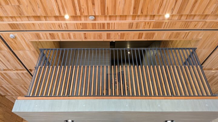 階段の手すりはスチールの下部に木でアクセントを入れてあり、こちらも定番のディテール。