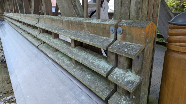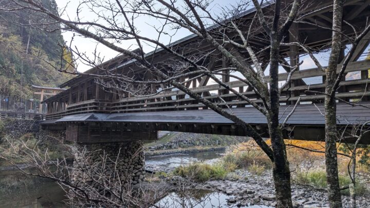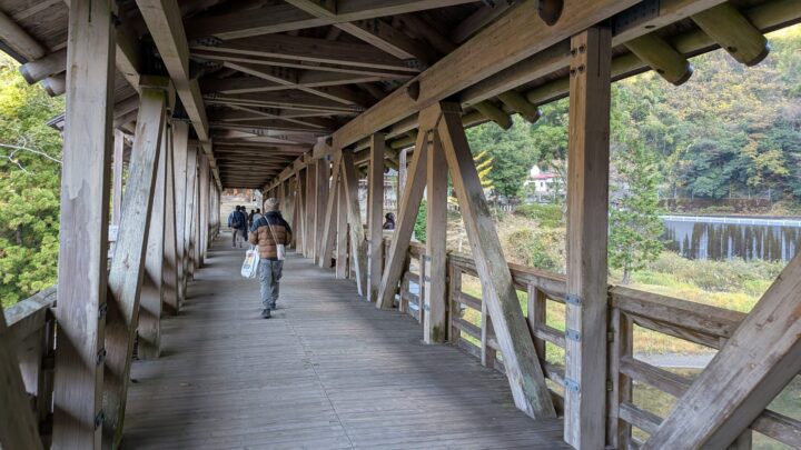 屋根がかかり、劣化対策も万全な集成材と鉄のハイブリッド橋です。2002年竣工。
